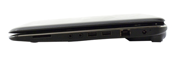 На правой грани расположен картовод, аудиоразъемы, еще два порта USB, разъем для проводной сети, разъем питания. Надо отметить, что штекер питания у этого ноутбука прямой, толстый и достаточно длинный, сантиметра три. Торчит он неудобно.