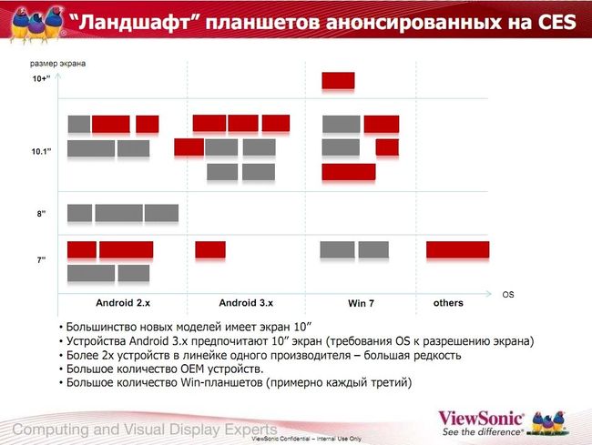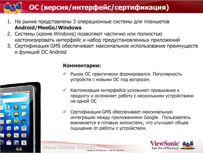 В отношении ОС очень правильно высказался представитель компании, комментируя утверждение, что Android 2.х — ОС для телефонов, а для планшетов надо использовать Android 3.0. Надо разделять маркетинговые усилия производителя (которому выгодно развести 2.х и 3.0) и реальное положение дел на рынке.