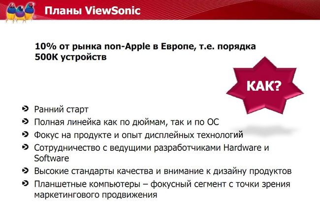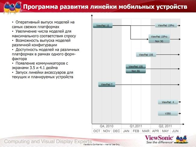 Как видите, у Viewsonic есть неплохой задел — уже вышли на рынок продукты, есть широкая линейка, т. е. механизм продаж уже налажен. Поэтому новые модели будут появляться уже в рамках созданной инфраструктуры и налаженного канала продаж. Например, если я правильно помню, Viewpad 7 предлагается оператором МТС.
