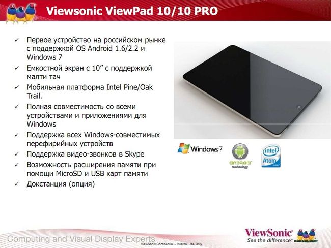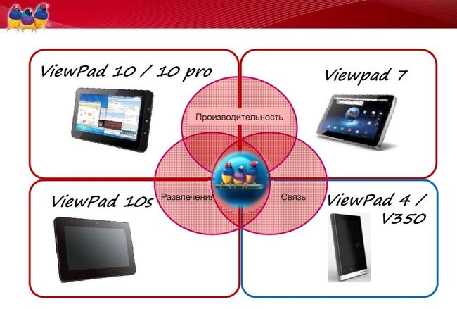 Как видите, в четвертом квартале уже запущено два основных продукта — 7-дюймовый планшет на Android 2.2 и 10-дюймовая модель Viewpad 10 с Windows 7 и Android, но о нем мы поговорим в деталях чуть позже. В ближайшее время на рынок выйдет более новая модель 10 Pro, тоже с двумя операционными системами, но на новом поколении платформы Intel Oak Trail.