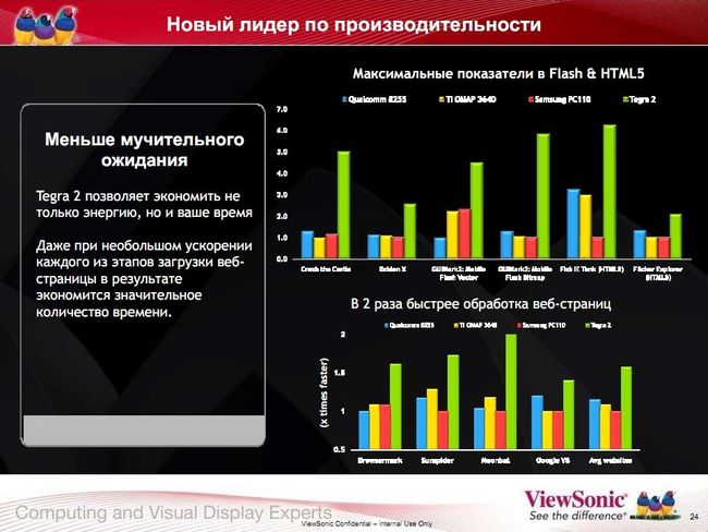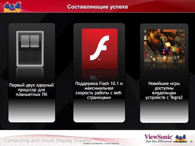 Во-первых, в Tegra 2 применяется двухъядерный процессор, это дает целый ряд преимуществ. Пока, правда, во многом теоретических, т. к. необходима и оптимизация ПО — в частности, операционной системы. Во-вторых, в ней есть графический ускоритель, что позволяет создавать для планшетов приложения с красивой графикой и трехмерные игры. Наконец, благодаря высокой производительности эта платформа позволяет полноценно работать с Flash.