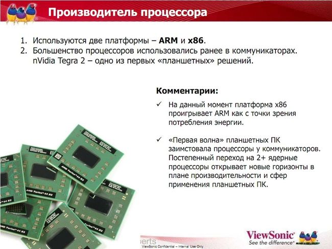 Про процессоры и платформы уже было сказано выше. Если говорить об ARM, то действительно сейчас все активно пиарят NVIDIA Tegra 2, которая должна перевернуть рынок планшетов. Посмотрим… По крайней мере, эта платформа больше учитывает потребности именно планшетов.