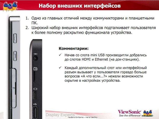 - внешние интерфейсы (вот здесь реально — кто в лес, кто по дрова, начиная от богатейших возможностей у китайских планшетов и кончая полным минимализмом у Apple).