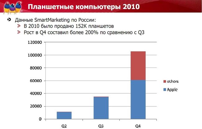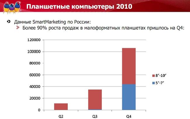 Рост сектора планшетов в России тоже очень высокий, хотя общие объемы значительно меньше. Кстати, стоит отметить, что анализ рынка не совсем точен, т. к. он не учитывает серые поставки и поставки многочисленных китайских устройств. Т. е. в реальности рост рынка еще выше.