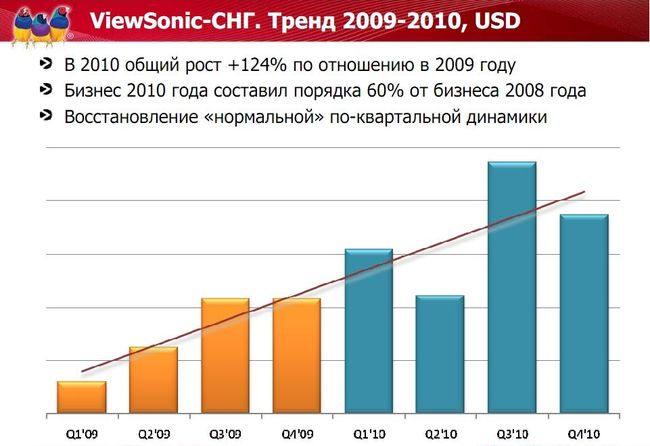 В 2010 году продолжилось восстановление рынка после кризиса 2008 года. Восстанавливаются и объемы бизнеса Viewsonic. Кроме того, квартальная структура рынка вернулась к докризисному распределению. Вообще, по многим параметрам 2010 год для Viewsonic стал зеркальным повторением 2008-го.