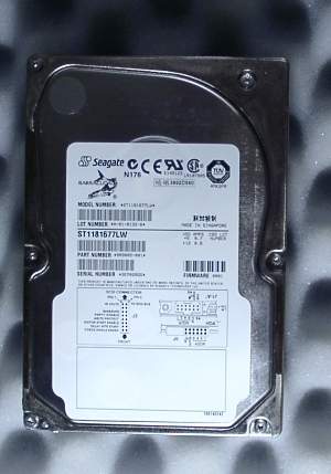 Диск выпускается в 6 вариантах: есть 3 версии интерфейса — Ultra160 (»LW»), Ultra160 SCA (»LC») и Fibre Channel (»FC») и модели с разным объемом буфера — 4 или 16Mb (индекс «V») (последний позиционируется для потоковых видео приложений). У нас была модель для интерфейса Ultra160 с 4Mb буфера (ST1181677LW). Кстати, для этого диска в названии моделей у Seagate впервые присутствует 7 цифр и запомнить их становится еще сложнее :).
