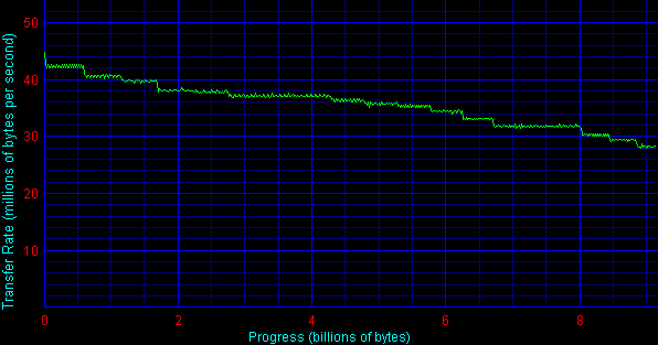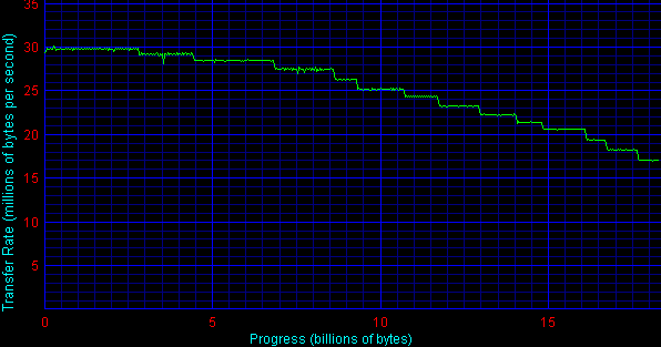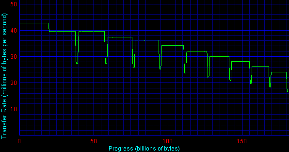 Обратите внимание на странный график у диска Barracuda 180 — переход между зонами сопровождается значительными провалами в скорости. Это может сильно повлиять на качество работы диска, например, с видеопотоками (там может потребоваться и более 20Mb/s для одного потока неупакованного видео). Похожая картина (но с меньшими потерями) наблюдается и у Cheetah X15. Возможно, что это связано с тем, что тестировался опытный образец диска и на серийных экземплярах такого эффекта не будет (заметим, что другие программы тестирования линейной скорости чтения показали аналогичные результаты).