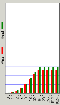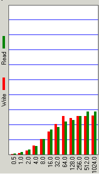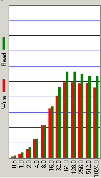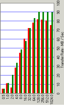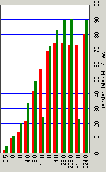 Из сравнения результатов теста ATTO Disk Benchmark для работы диска по USB 2.0 и UATA/100 выясняется, что под UATA/100 заметно лучше работа диска с маленькими блоками, поэтому скорость USB-накопителя при работе с мелкими файлами ожидается скромной, что впоследствии и подтвердится. К тому же, практически полностью отсутствует преимущество из-за кэширования некрупных файлов буфером винчестера.