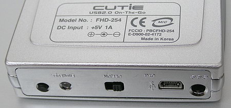 На блестящем никелированном торце корпуса «Кати» расположены: разъем интерфейса USB 2.0 («mini-B», так что кабели, особенно «гнездовой», для него придется носить с собой и не терять), разъем пятивольтового питания (о питании чуть позже) и выключатель питания накопителя. Также здесь присутствует третий светодиод (для индикации ошибок в работе) и та самая «магическая» кнопка копирования (почему-то без подписи, хотя остальные «органы» рельефно подписаны). Этой же кнопкой можно вручную прервать копирование (начинать придется сначала). На верхней (ли?) крышке «Кути» есть еще два светодиода — один из них мигает при обращениях к диску, а другой показывает, когда встроенный аккумулятор заряжается.
