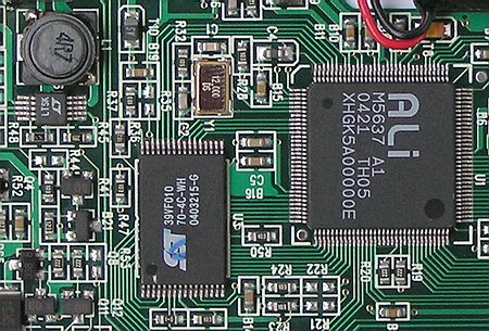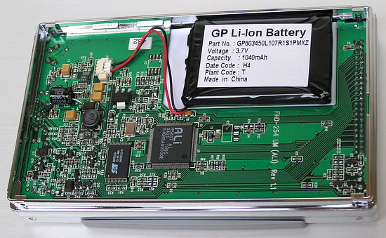 В «нижнем» отсеке корпуса очень вольготно (то есть практически без экономии рабочего пространства) располагается небольших размеров литий-ионный аккумулятор (из тех, которые часто применяются в карманных компьютерах) и вся электроника, сердцем которой является контроллер ALi M5637 с поддержкой функций On-The-Go.