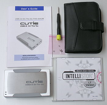 помимо самой «Кути» и вышеупомянутой сумочки идут целых четыре USB-кабеля (на фото ниже), компакт-диски (мини-CD с драйверами под Windows 98 и другой CD — с программой резервного копирования Clarus IntelliStor LT), тоненький юзер-мануал с минимально необходимыми сведениями, несколько запасных минивинтиков (если потеряются основные, скрепляющие корпус) и компактная отвертка для них,
