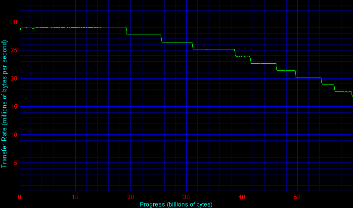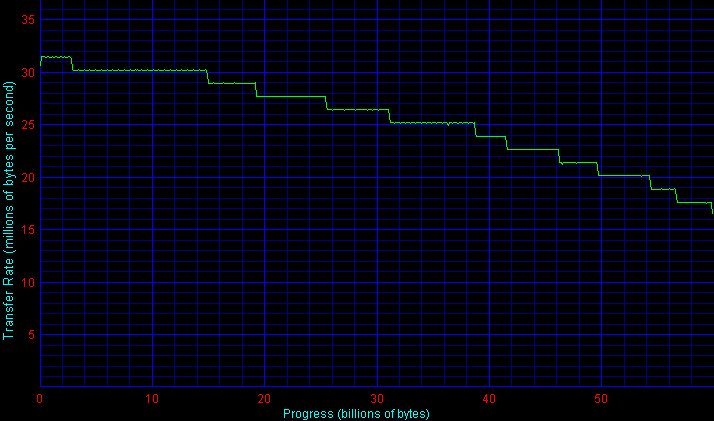 Скорость работы интерфейса USB у «Кати» вполне приличная — под 30 Мбайт/с. Это, конечно, не рекорд (с некоторыми другими устройствами мне удавалось получать и 34-35 Мбайт/с для Hi-Speed USB), и «верхушку» графика Transfer Rate у винчестера такой внешний интерфейс немного обрезает.