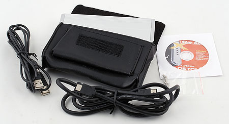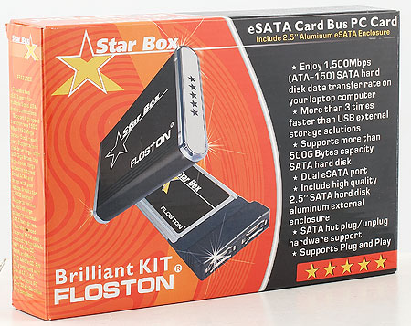 Floston Star Box Brilliant KIT интересен тем, что это не просто банальная коробка с интерфейсом eSATA, а именно KIT. В него входит также PCMCIA-адаптер с двумя портами eSATA, что позволяет получить поддержку нового интерфейса и владельцам относительно старых ноутбуков. Для современных требовался бы ExpressCard, но в них и сами по себе порты eSATA часто встречаются. Плюс все необходимые кабели, плюс невысокая цена комплекта. Так что познакомимся с нашим героем более подробно.