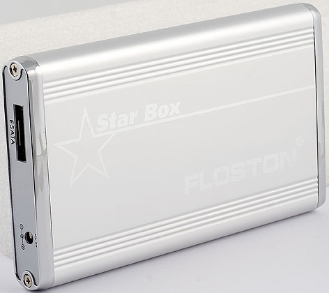 На первый взгляд, сама коробка не отличается от прочих контейнеров Floston, рассчитанных на 2.5″ винчестеры. Это все тот же алюминиевый корпус со скругленными боковинами (на выбор доступны четыре цвета: черный, серебристый, синий и красный; у нас был второй), размерами 130×15×80 мм и массой 125 грамм, как, например, исследованный почти год назад внешний модуль с USB-интерфейсом. На одном торце, как обычно, пять звездочек, подсвечивающихся при работе светодиодом, на другом — «круглый» разъем питания и интерфейсный. Правда, на этот раз, не USB mini-B, а eSATA. Это все внешние различия.