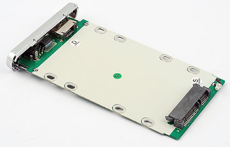 Разбирается модуль так же: откручиваем два винта и вынимаем основную плату с жестко прикрепленным к ней «активным» торцом. Плата интереснее. Хотя, на первый взгляд, такая же, как и раньше, — только РАТА-разъем (44-х контактный) заменен колодкой с двумя SATA-разъемами: интерфейсным и питания. Сложностей это не вызывает, хоть их и два — расположение разъемов одинаково на всех мобильных SATA-винчестерах. Соответственно, и сборка устройства выглядит, как и раньше: кладем винчестер на плату, «вдвигаем» в разъем, фиксируем двумя входящими в комплект болтиками. Но не будем спешить с этим, а вначале внимательнее изучим плату.