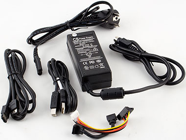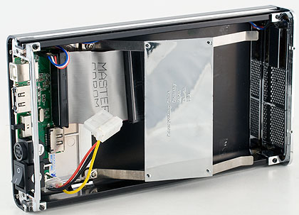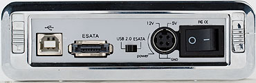 Что касается задней панели, то отличается она от более старых модулей серии незначительно. Разумеется, на ней появился разъем eSATA, а также простой ползунковый переключатель, позволяющий его задействовать при использовании внутри SATA-винчестера, но вот остальное очень привычно — USB-разъем типа В («большой»), выключатель питания и разъем для подключения блока питания в формате miniDIN 6 (как и в других внешних модулях аналогичного форм-фактора).