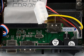 Смена SATA-винчестера на PATA и обратно лишь немногим сложнее вышеописанной процедуры. Если мы полностью разберем устройство, то можно добраться до основной платы. Вот она-то уже прикручена винтиками — при такой конструкции снимать ее никогда не потребуется. Мост установлен на нижней стороне, там же и прочие элементы, коих совсем немного, а на верхней плате три разъема: PATA, SATA и питания. Для подключения к первым двум в комплект входят короткие кабели соответствующих типов, которые, в принципе, можно попробовать и не снимать вообще. С питанием так поступить вряд ли удастся — разъем один, так что кабели нужно менять в зависимости от того, что в данный момент времени требуется — «молекс» или SATA-питание. Но эта операция тоже выполняется очень быстро — главное, соответствующий кабель не потерять где-нибудь :)