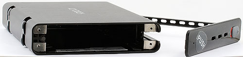 На лицевой поверхности устройства можно обнаружить светодиодный индикатор активности (под прорезями), да большой резиновый ползунок, напоминающий кнопку. Именно он напрямую связан с наиболее интересной особенностью устройства — быстрой сменой винчестеров без помощи инструментов. Все просто — это фиксатор. Если его освободить, то передняя крышка вместе с частью боковины просто откидывается и перед нами «слот» для установки винчестера. Осторожно помещаем его туда и двигаем в направлении задней стенки вплоть до контакта с разъемами. Потом закрываем всю конструкцию, передвигаем фиксатор в положение «заблокировано» и работаем. Нужно извлечь винчестер? Снова открываем переднюю крышку, причем конструкция из нее и боковины специальным язычком «подцепит» при открывании и винчестер, так что последний выдвинется на несколько сантиметров вперед, и его можно будет спокойно извлечь рукой. Все проще и быстрее не только чем в случае обычных внешних модулей, но даже и традиционных Mobile Rack'ов, где нужно винчестер сначала в одну коробку уложить, потом ее в другую вставить.