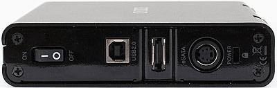 На задней стенке обнаруживается традиционный набор: выключатель питания, интерфейсные разъемы (в нашем случае USB типа В и eSATA), разъем для подключения блока питания и прорезь для замка Кенсингтона (с использованием которого мне вот лично за все годы сталкиваться не довелось ни разу). Разъем блока питания — miniDIN 4, поскольку последний выдает сразу и напряжение +5 В, и +12 В (по 2 А на каждой линии). Как я уже говорил, такой подход имеет свои плюсы и минусы. Плюс в том, что сам внешний модуль полностью освобожден от схем преобразования энергии (пусть и низковольтных, но и они тепло выделяют, что нежелательно), что положительным образом сказывается на тепловом режиме и размерах. Минус — найти БП на два напряжения сложнее, чем на одно, а найти его еще и с именно таким разъемом, какой нужен, почти нереально. Единого же жесткого стандарта тут нет, так что, например, «коробочки» от Floston и RaidSonic (которые мы регулярно рассматриваем — других, в общем-то, тоже касается) имеют разные разъемы. Даже чисто механически несовместимые, хотя и там, и там miniDIN 4. А блок питания — товар не гарантийный, что следует учитывать.