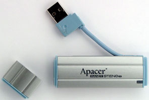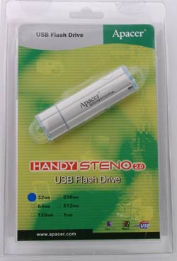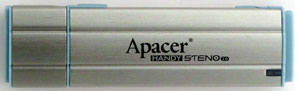 Не ошибусь, если скажу, что это устройство является для нас первым не только по алфавиту, но и по важности среди всей тестируемой пятерки :) Кстати — первым флэшдрайвом второго поколения, который я тестировал, был HandyDrive от Apacer. Новую эру мы открываем опять накопителем этой фирмы. Прямо-таки символично :) Название только немного изменилось, но это фирма о единообразии позаботилась: новое имя логично дополнило ряд PhotoSteno, AudioSteno, MegaSteno и так далее.