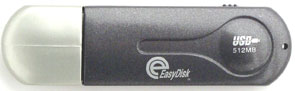 EasyDisk всегда базировался на контроллере SSS: недорогом, но обеспечивающем невысокую скорость работы и большое время доступа. Это было не очень критично для младших моделей накопителя, однако сильно не нравилось покупателям старших. Именно поэтому компания решила увеличить скорость своих устройств: на рынок вышли Mini EasyDisk и EasyDisk Higher Speed. О первом устройстве мы поговорим ниже, а второе представляет собой обычный EasyDisk емкостью 512 Мбайт или 1 Гбайт (вообще говоря, согласно инструкции существуют и модели меньшего объема, однако сейчас поставляются только два старших варианта), но на контроллере OTi, а не SSS. Как мы уже установили в предыдущих частях эти контроллеры заметно быстрее. Фирма указала очень оптимистичные цифры в спецификации — 950 Кбайт/с запись и 1100 Кбайт/с чтение. Разумеется, рассчитывать на это не стоит — 12 Мбит/с USB 1.1 на практике могло бы обеспечить лишь 1 Мбайт/с (шина-то последовательная, так что где-то треть ее пропускной способности уйдет на накладные расходы), а на деле не самый удачный протокол работы способен снизить эту цифру еще процентов на 15 (в лучшем случае и если производитель сильно постарается, то на пять). Ну а про реальную скорость работы мы поговорим ниже.
