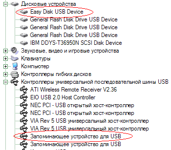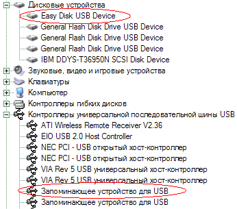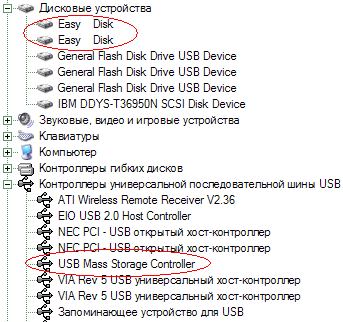 Разбитое таким образом устройство в списке видно даже другим образом: один «USB Mass Storage Controller» порождает сразу два «Дисковых устройства» типа «Easy Disk». Разумеется, каждому диску присваивается отдельная буква. Для чего это нужно? Ну, например, для лучшего контроля за содержимым, т. е. за тем же, зачем на разделы разбивают винчестер (еще пять лет назад, кстати, 1 Гбайт считался достаточным размером для жесткого диска, а сейчас столько и флэшдрайв иметь может).