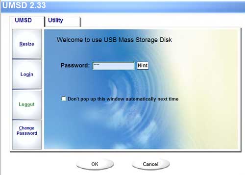 Если на компьютере, куда подключается защищенный накопитель уже установлено UMSD, сразу при подключении всплывет специальное окно для ввода пароля (впрочем, его автоматическое появление можно и запретить). Если UMSD не установлено, то следует запустить инсталлятор с открытой части накопителя и свести задачу к предыдущей :) После ввода пароля открытая часть исчезнет, а под тем же именем станет видно содержимое защищенной. С остальными кнопками тоже все просто: можно отключить защищенную часть и снова увидеть открытую при помощи Logout или изменить пароль. Чем, кстати, удобен третий способ разбиения — «выделенный» дополнительный накопитель будет доступен независимо от того, с какой из частей защищенного мы работаем.