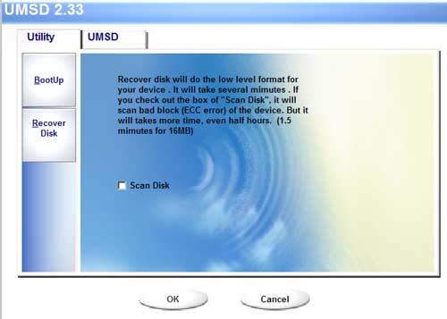 Куда более полезна возможность низкоуровневого форматирования устройства, предоставляемая по кнопке «Recover Disk». Можно просто отформатировать устройство (если, например, вы забыли пароль), а можно провести и тестирование для обнаружения сбойных блоков.