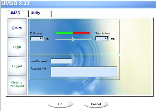 С открытой частью все просто. На две части устройство делится легко и непринужденно, точно так же, как в версиях 1.Х — выбираем их размеры, задаем пароль и подсказку для него, нажимаем кнопку ОК. Замечу, что минимальный размер каждой части составляет 1 Мбайт: открытой потому, что туда записывается сама UMSD (чтоб на другом компьютере доступ получить), закрытой потому, что при меньших размерах нечего и огород городить.