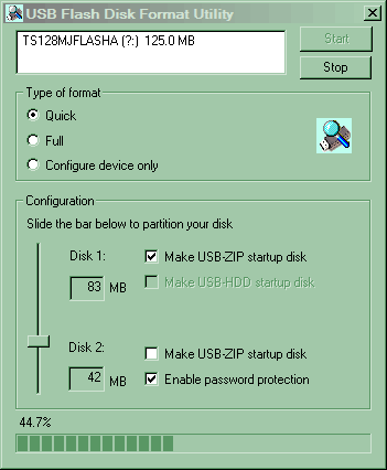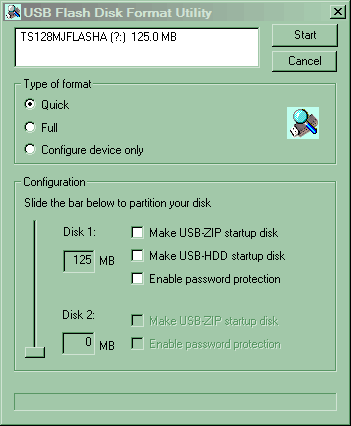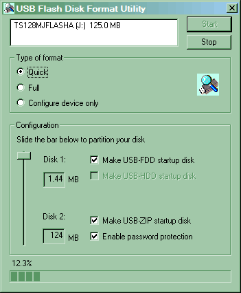 И еще более извращенный случай. Первая часть имеет размер 1,44 Мбайт и сделана загрузочной как USB-FDD. Вторая же часть защищена паролем (хотя это и не обязательно) и сконфигурирована как USB-ZIP. Как устройству определить, с какой части грузиться? Для этого и существует ползунок: в положении FDD загрузка идет с первой части, а в ZIP — со второй. Вообще, для загрузки с виртуального флопика полжение ползунка должно быть таким, даже если вторая часть не является загрузочной.