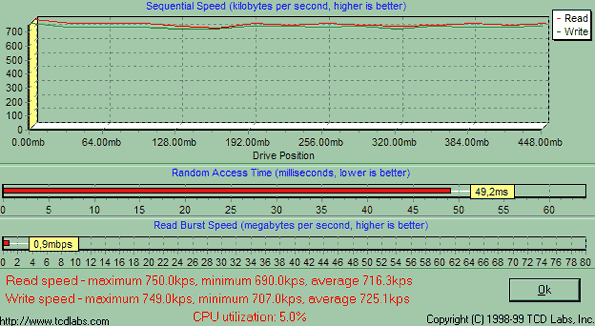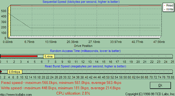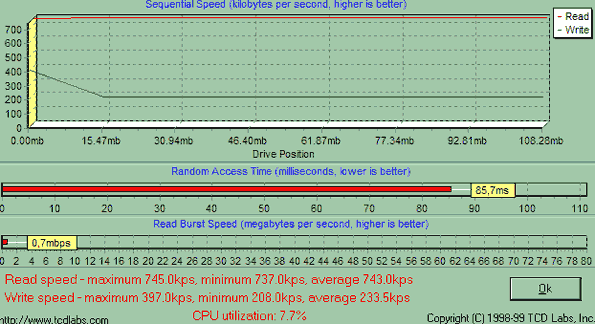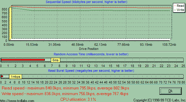 Видно, что скорость записи действительно заметно увеличилась и близка к заявленной. Вообще: перед нами новый рекордсмен по скорости записи, наконец-то обогнавший M-Systems DiskOnKey! Однако вот про скорость чтения такого сказать невозможно: не рекордная, да и от спецификации далековато. Тестирование при помощи WinBench'99 дало те же результаты, так что их следует считать правильными. Примечательно, что, по сравнению с предыдущей моделью, значительно уменьшилось время доступа, дойдя до приличного значения.