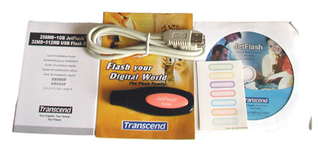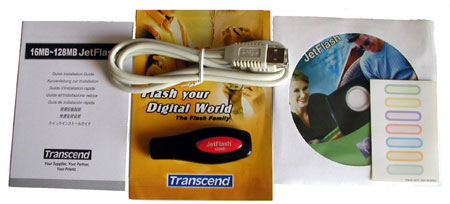 Кроме самого флэшдрайва, в коробке также присутствуют: инструкция по эксплуатации, рекламный буклет по продуктам флэш-памяти от Transcend, USB-удлинитель компакт-диск с драйверами для Windows 98 и несколько цветных наклеек, похожих на дискетные (для них имеется место на боку устройства).