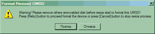После нажатия кнопки Resize флэшдрайв будет переформатирован (помните об этом!). Впрочем, не сразу — меня ожидал еще один весьма неприятный сюрприз: