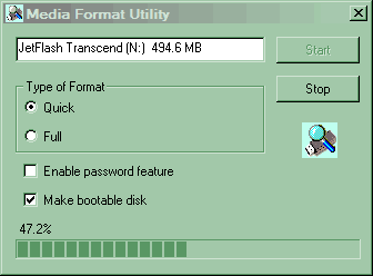 Как и младшие модели, эта поддерживает парольную защиту и загрузку компьютера. То, что устройства отличаются, а также разный вид прилагаемых компакт-дисков натолкнул меня на мысль, что и программное обеспечение будет отличаться. Я решил ее проверить, о чем абсолютно не пожалел. По прилагаемому программному обеспечению старшие модели JetFlash эквивалентны Luwen EasyDisk нового типа, да и драйверы для Windows 98 у них одинаковые (наверняка контроллер одинаковый). Стало быть, парольная защита не очень удобна (о ней вы можете подробно прочесть в статье по EasyDisk) и уступает младшим JetFlash, а вот про создание загрузочного устройства этого не скажешь. Помнится, сильнее всего мне мешала невозможность создать незащищенный, но загрузочный EasyDisk под управлением NT/2000, ввиду ошибки в программе Media Format (она и не пыталась делать загрузочное устройство под этими ОС, а вместе с установкой защиты образ дискеты можно было перенести). Так вот — вместе с JetFlash поставляется новая версия утилиты, где этот баг исправлен. Теперь галочка «Make Bootable Disk» ставится. Поиск образа дискеты в случае, если не устанавливать параллельно «Enable Password Feature», идет не в каталоге UTI_DIR, а в каталоге XP_BOOT. В результате и под версиями Windows на базе ядре NT теперь можно сделать загрузочный флэшдрайв с любой простой операционной системой (была бы только ее загрузочная дискета в наличии), а, может быть, и не только простой (но на эксперименты у меня уже не было времени), причем нормально поддерживающий и чтение, и запись. А выглядит программа так же, как и раньше. И для EasyDisk она тоже подходит, как выяснилось (я проверил).