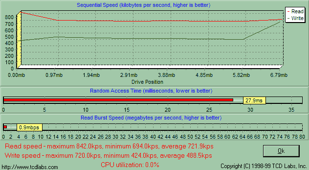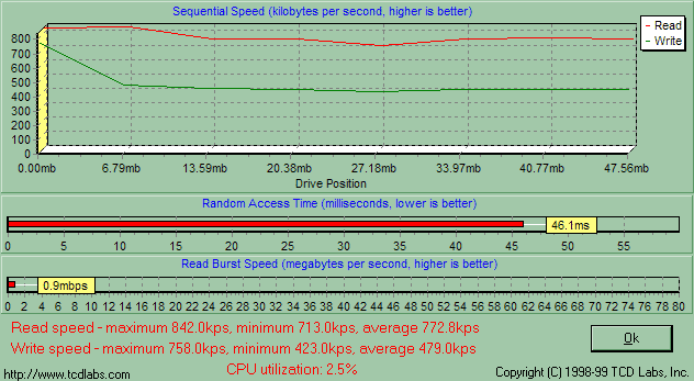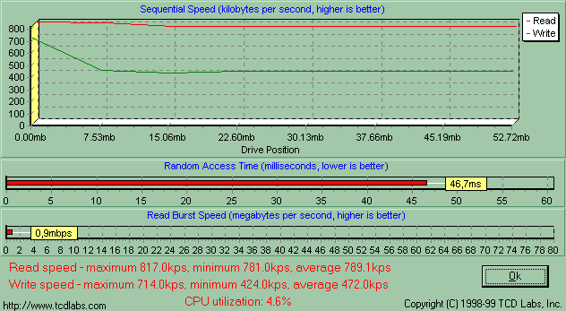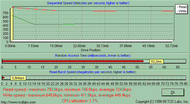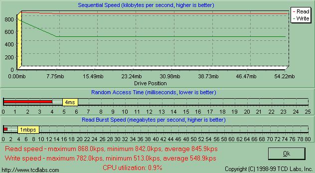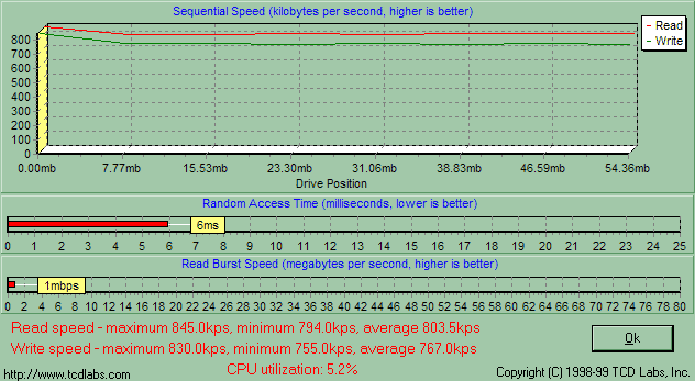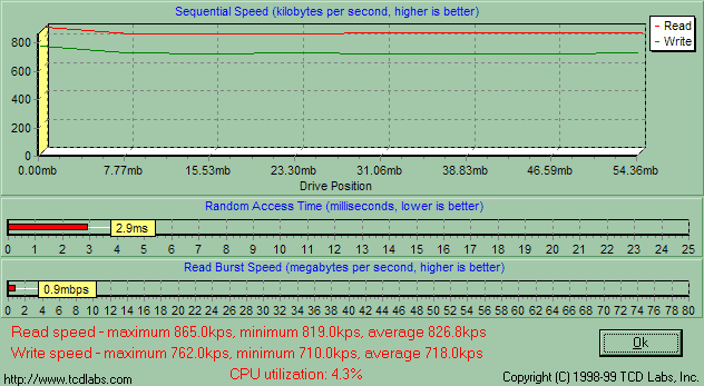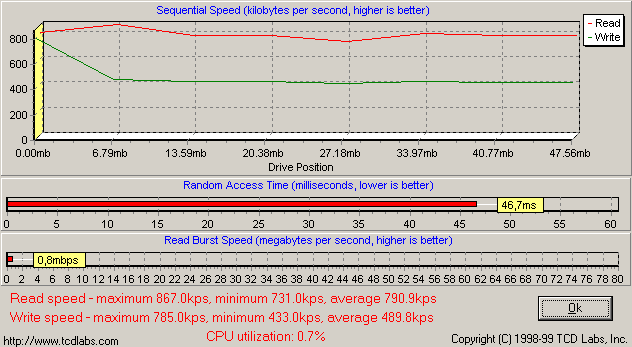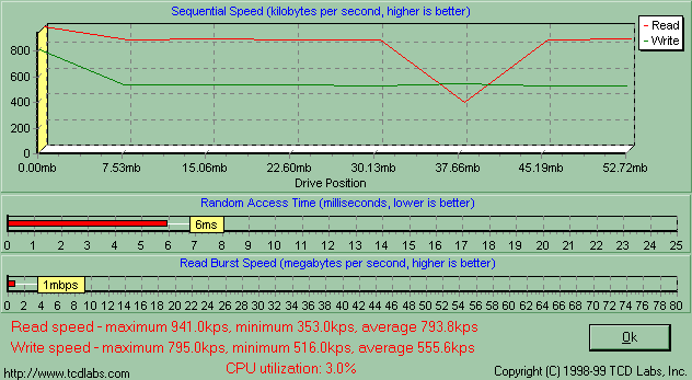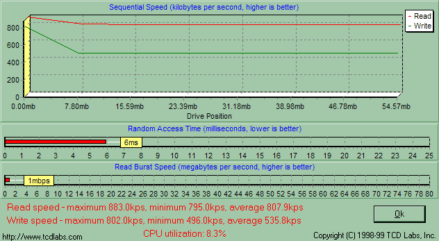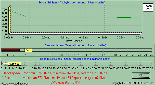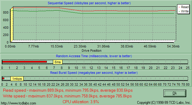 Одинаковость утилит парольной защиты и драйверов говорит о том, что PQI MiB и Transcend JetFlash емкостью от 16 до 128 Мбайт собраны на одном и том же контроллере, а, значит, скорость их работы будет зависеть лишь от самой памяти. Обе компании применяют быстродействующие микросхемы, так что я априори ожидал от MiB очень высокой скорости работы, и действительность меня не обманула. Здесь подробный график HD Tach, а «разбор полетов» ниже.