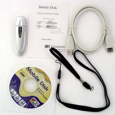 Подобно PQI, накопитель поставляется в компактной пластиковой упаковке. Комплект поставки несколько богаче, чем у MiB: накопитель, краткая инструкция, CD с драйверами и программным обеспечением, USB-удлинитель и два шнурка — для ношения накопителя на запястье и на шее. Единственное, что хуже, чем у MiB — CD имеет стандартные размеры, так что носить его с собой менее удобно.