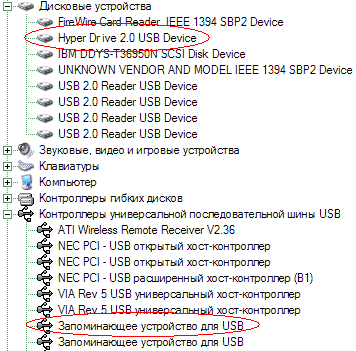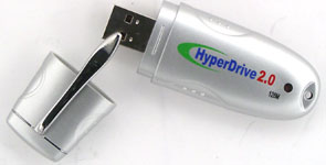 Найдя на коробке упоминание о парольной защите я обрадовался, но оказалось, что такую возможность поддерживает лишь один из накопителей со старым интерфейсом, а коробка на всех одна. Судя по ней, кстати, модельная линейка широка — объем от 16 Мбайт до 1 Гбайт (неясно, правда, к каждому ли типу накопителя это относится). Замечу еще, что драйверы для Windows 98 идентичны прилагаемым к двум ранее протестированным нами накопителям с интерфейсом USB 2.0, а вот в списке устройств Hyper Drive 2.0 выглядит совсем по-иному — система называет его точно.