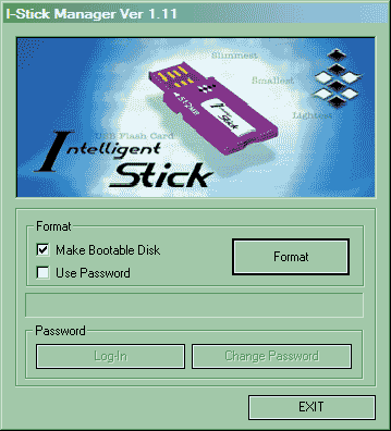 Комментарии излишни: теперь Intellegent Stick не только самый миниатюрный флэшдрайв — его пользователи могут совсем ни в чем себе не отказывать, получив заодно возможность загрузки с накопителя и парольную защиту. Впрочем, возможности загрузки несколько ограничены — только Windows 98, благо имидж системной дискеты встроен прямо в тело утилиты. Зато все это отлично работает, да и возни ненужной нет: даже под управлением Windows XP можно просто нажать одну кнопку, не заморачиваясь с возней с икетами (особенно если учесть, что дисковод медленно, но верно перестает быть стандартным оборудованием).