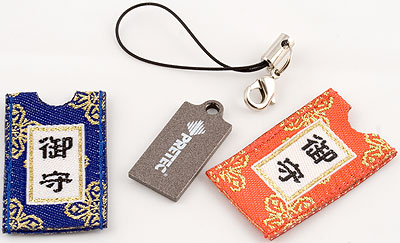 Как я уже сказал, внешне сам накопитель не изменился, да и не мог — меньше его сделать вряд ли бы удалось (размеры, напомню, составляют 21×11,9×1,9 мм, а масса — менее 1 грамма), а увеличивать не имело смысла. А вот комплект поставки поменяли — исчезло кольцо для ношения флэшдрайва с ключами, а также металлическая загогулина для превращения устройства в сережку, по поводу которой я зубоскалил в прошлый раз :) Зато на месте осталась петелька с карабином, позволяющая прикрепить накопитель к, например, мобильному телефону или еще куда-нибудь, дабы не потерять кроху при транспортировке. А добавились два искусно расшитых чехольчика (красный и синий) с одинаковой парой японских иероглифов на каждом. Как многим известно, в странах Дальнего Востока уделяют большое значение символической стороне жизни. Вот и эта пара, как я понял из пояснения на упаковке, символизирует удачу. В любых сферах жизни — любви, карьере, здоровье и т. п. В общем, если Diamond являлся просто симпатичным аксессуаром, то Charm, по замыслу производителя, это уже скорее настоящий талисман, призванный улучшить жизнь владельца. Ну и, разумеется, позволить последнему носить с собой необходимый для счастливой жизни объем информации, не превышающий один гигабайт.