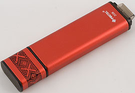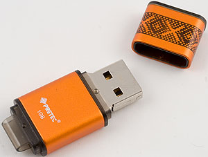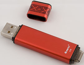 Внешне накопитель очень сильно напоминает предыдущую модель. Не размерами — они составляют 70×17×6 мм, хотя масса «прописана» аналогичная — 10 грамм, а формой. Те же строгие прямые линии, тот же колпачок, в рабочем состоянии фиксирующийся на задней части флэшдрайва, опять же, конкурирующий в данном случае за «место под солнцем» со шнурком для ношения устройства на шее или кольцом для ключей (если, конечно, вы таковые сами добудете — в комплекте ничего подобного нет, как и в предыдущем случае), даже орнамент на колпачке такой же. В общем, удлиненный почти вдвое Mambo и все тут :) И даже все та же присоска с зажимом в комплекте приложена, как и предыдущем случае. Даже лозунг «Store in Style» на упаковке в обоих случаях присутствует, а у других накопителей Pretec как-то не припоминается, чтоб такой был.
