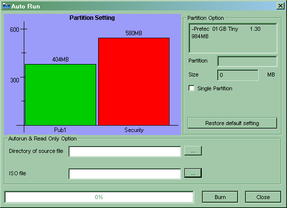 «Auto Run» несколько сложнее, чем может показаться из названия. Программа не просто делает какие-либо файлы автоматически выполняемыми, более того — делает она вообще не это :) Ее задача — превращать часть емкости накопителя в виртуальный CD-ROM, куда будет записан ISO-образ; готовый или сделанный самой программой на базе каталога с файлами. Разумеется, для CD автозапуск является штатной операцией очень давно, так что попутно мы и эту задачу решаем. Но не только ее: теперь есть возможность записывать стандартные ISO-образы. А также защищать от удаления и изменения важную информацию — для системы данный раздел выглядит как компакт-диск, причем массовые утилиты для работы с флэшками такой вот раздел удалить не могут. Даже если мы изменим конфигурацию разделов при помощи штатного «Flash Partition» созданные виртуальные CD-ROM останутся на месте — удалить их можно только при помощи самой «Auto Run».
