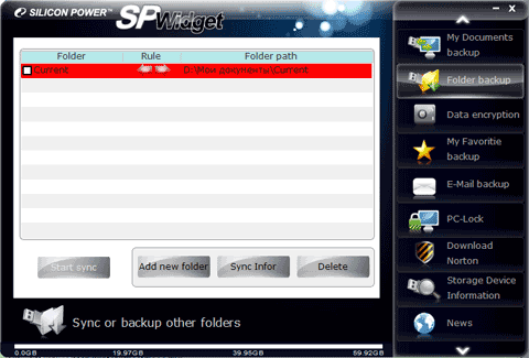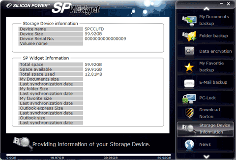 Седьмая кнопка всего лишь скачивает триальную версию Norton Internet Security 2009, а девятая — посылает пользователя читать новости на сайте Silicon Power, так что подробно мы ими заниматься не будем. Интерес представляет кнопка номер восемь, демонстрирующая страничку с подробной технической информацией о накопителе и о том, что нам наработала программа — по всем специальным папкам выдается их емкость (что достаточно полезно, поскольку они скрытые, так что пользователь «обычной» квалификации до них в Проводнике не доберется) и дата последней синхронизации. Сколько свободного места осталось на устройстве, кстати, хорошо видно на любой из страниц SP Widget.
