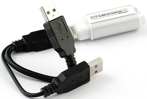 Но сначала придется отметить еще одно потенциальное слабое место устройства — энергопотребление. Производителя оно беспокоило настолько, что в комплект вложили даже специальный кабель для питания устройства от двух портов USB — привычный (но, кстати, не всегда нужный) аксессуар для внешних винчестеров, а вот флэшка с таким добавлением попалась нам впервые. Причем кабель рассчитан на подключение к USB 2.0, где по стандарту ток составляет всего 500 мА — по мнению конструкторов, проблем с USB 3.0, где это значение увеличено до 900 мА, быть не должно. Мы же выяснили, что они таки бывают — если использовать контроллер USB 3.0, не подключив к нему дополнительный «хвост» питания. Оказалось, что с шины PCIe они при этом что-то берут и большинству флэшек этого хватает, а вот DTU30 определяться отказался. К счастью, к питанию от нашего комбинированного ASUS U3S6 у него претензий не возникло.
