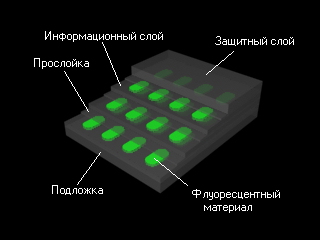 - Излучающийся флуоресцентный свет с любого слоя не когерентен, тем самым устраняется проблема множественных интерференций, которая присутствует в технологиях CD/DVD
