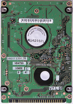 Выпущенный летом 2004 года данный экземпляр диска MHT2060AH по внутреннему устройству заметно отличается от диска MHT2040AH из нашего февральского обзора — тот был ровно на год старше (от июля 2003 года) и, мне почему-то кажется, использовал на самом деле не 40-гигабайтные, а менее плотные пластины (хотя точного доказательства последнего у меня пока нет). Впрочем, если попробовать пофантазировать на предмет расшифровки «парт-намберов» этих моделей, а точнее — четырех последних цифр P/N (сравните фото обоих дисков из этой и той статей), то можно предположить, что самая последняя соответствует емкости модели в десятках Гбайт, а предпоследняя — количеству головок в модели. Если это так, то прошлогодняя 40-гигабайтная модель использовала 27-гигабайтные пластины (и три головки), а 60-гигабайтная модель этого лета — 30-гигабайтные пластины и 4 головки. И это очень похоже на правду, если взглянуть на графики линейной скорости чтения — у этой, более современной модели он тоже явно недобирает до типичного уровня, демонстрируемого моделями конкурентов на 40-гигабайтных пластинах (см. ниже).