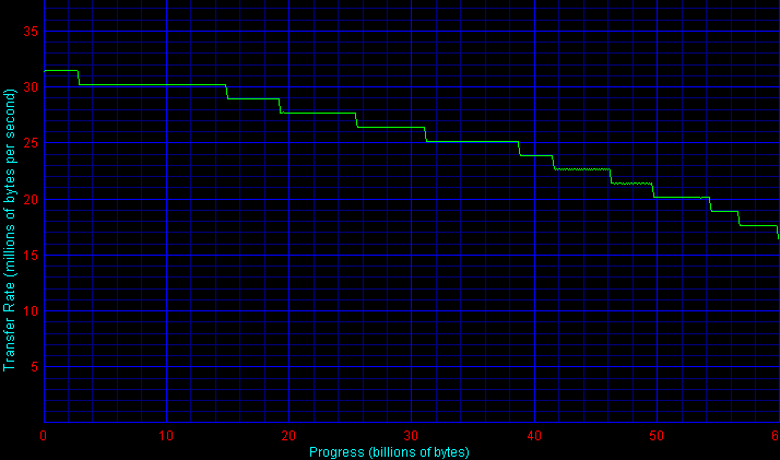 График идеально гладкий — как «хорошее стекло». Но проходит он намного ниже, чем графики у аналогичных дисков конкурентов. И действительно, даже модель MHT2060AH (уже не говоря о прошлогодней MHT2040AH) явно уступает всем современным пятитысячникам как по максимальной, так и по средней и минимальной скоростям линейного чтения.
