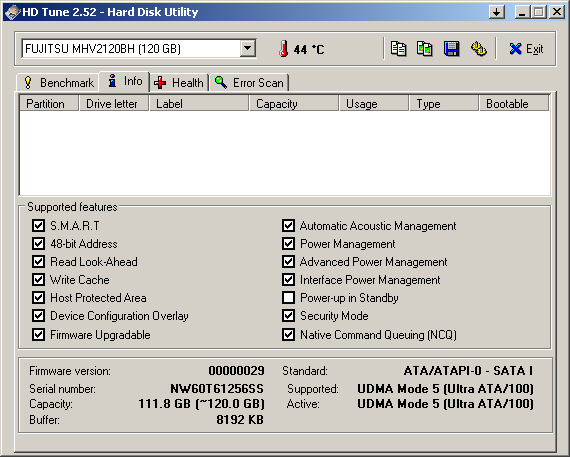По сравнению с предшественниками серии MHT2BH/AH у новых пятитысячников Fujitsu не только возросла максимальная емкость моделей (появились диски на 100 и 120 Гбайт), но и увеличилась плотность записи, возросла скорость линейного доступа, заметно (с 225 до 300 G). Повысилась рабочая ударостойкость, несколько снизился акустический шум, а также заметно (процентов на 20) понизилось энергопотребление. А SATA-модели стали поддерживать Native Command Queuing (NCQ). Основные технологические особенности этих накопителей: FDB (Fluid Dynamic Bearing) spindle motor, Head Load/Unload mechanism, Reduced Power Consumption, GDT (Glass Direct Texture) Media. Сравнивая новые модели Fujitsu с ближайшими конкурентами, стоит отметить, что особой разницы в паспортных характеристиках между ними не прослеживается, а как обстоит дело на самом деле с некоторыми из этих характеристик, мы и попробуем разобраться далее.