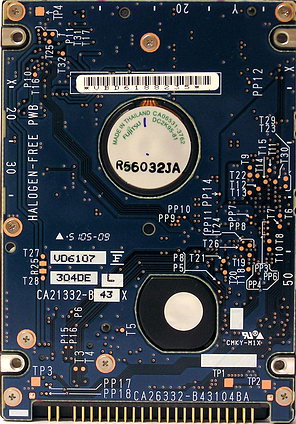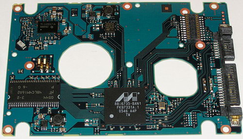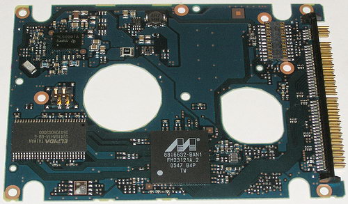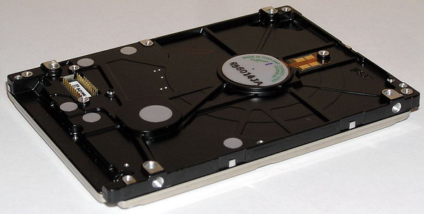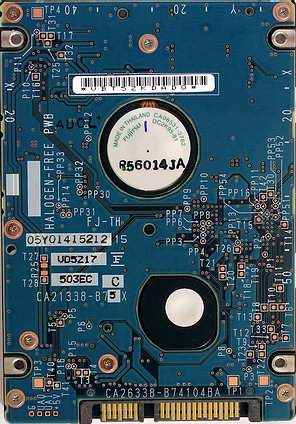 С обратной стороны диски Fujitsu этой серии с разными интерфейсами очень похожи и, как и остальные 2,5-дюймовые диски данного производителя, используют печатную плату на всю заднюю поверхность диска за исключением вырезов под выступы для моторов и креплений.