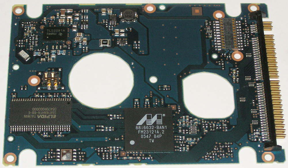 а к драйверу моторов подключен датчик ускорения (вибраций). Рядом с ним — мощный импульсный стабилизатор напряжения, управляемый от основного контроллера. Кстати, печатные платы у контроллеров таких дисков очень тонкие — всего 0,6 мм в толщину (с маской), хотя при этом и многослойные — как минимум, три слоя металлизации.
