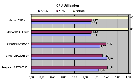 Здесь лидерство нового диска от Maxtor очевидно, причем различие между результатами, показанными при работе в «тихом» и «обычном» режимах, минимально.